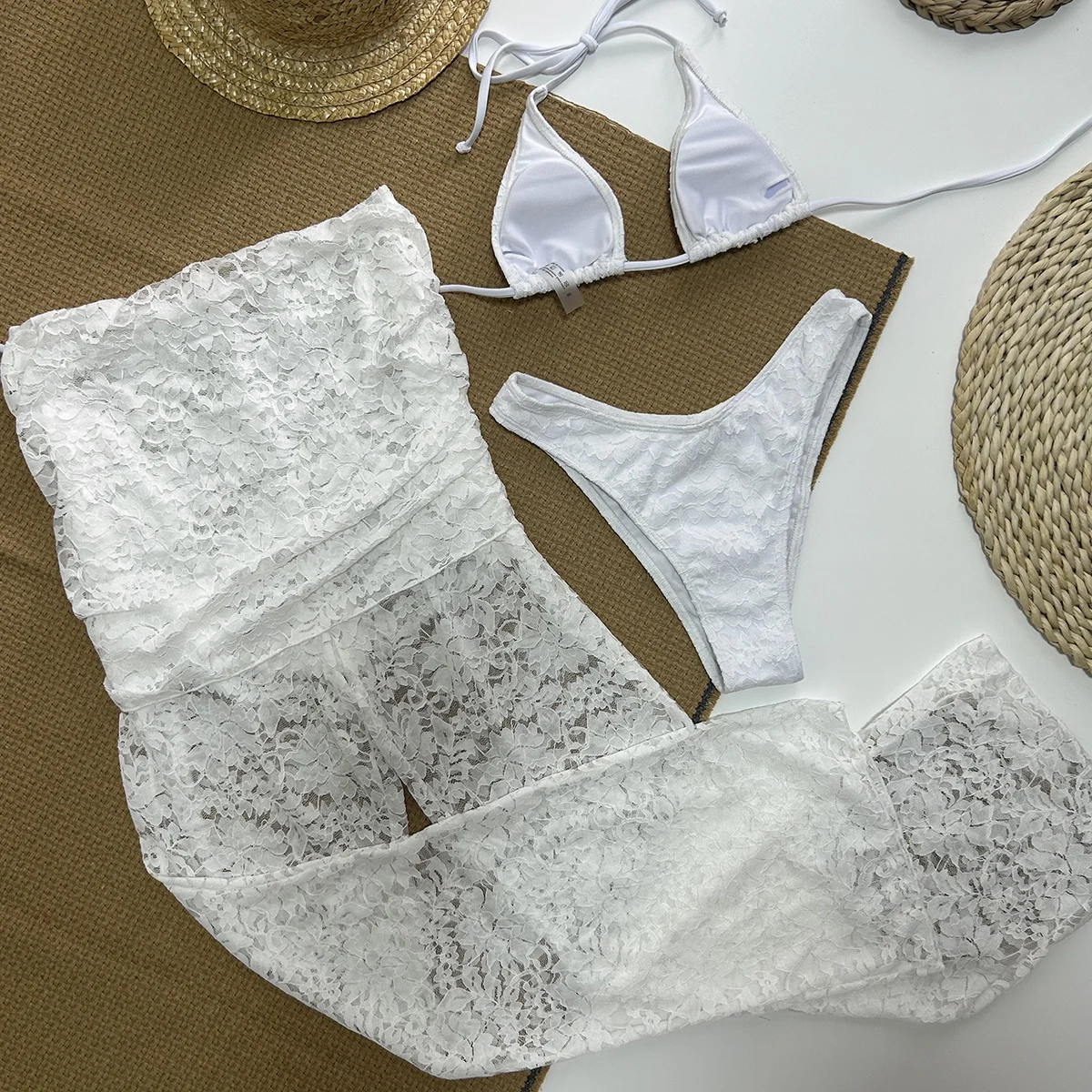 Set de bikini de 3 piezas con top push-up, braga y salida de encaje. Perfecto para playa, piscina y sesiones de fotos. Diseño sexy y moderno.