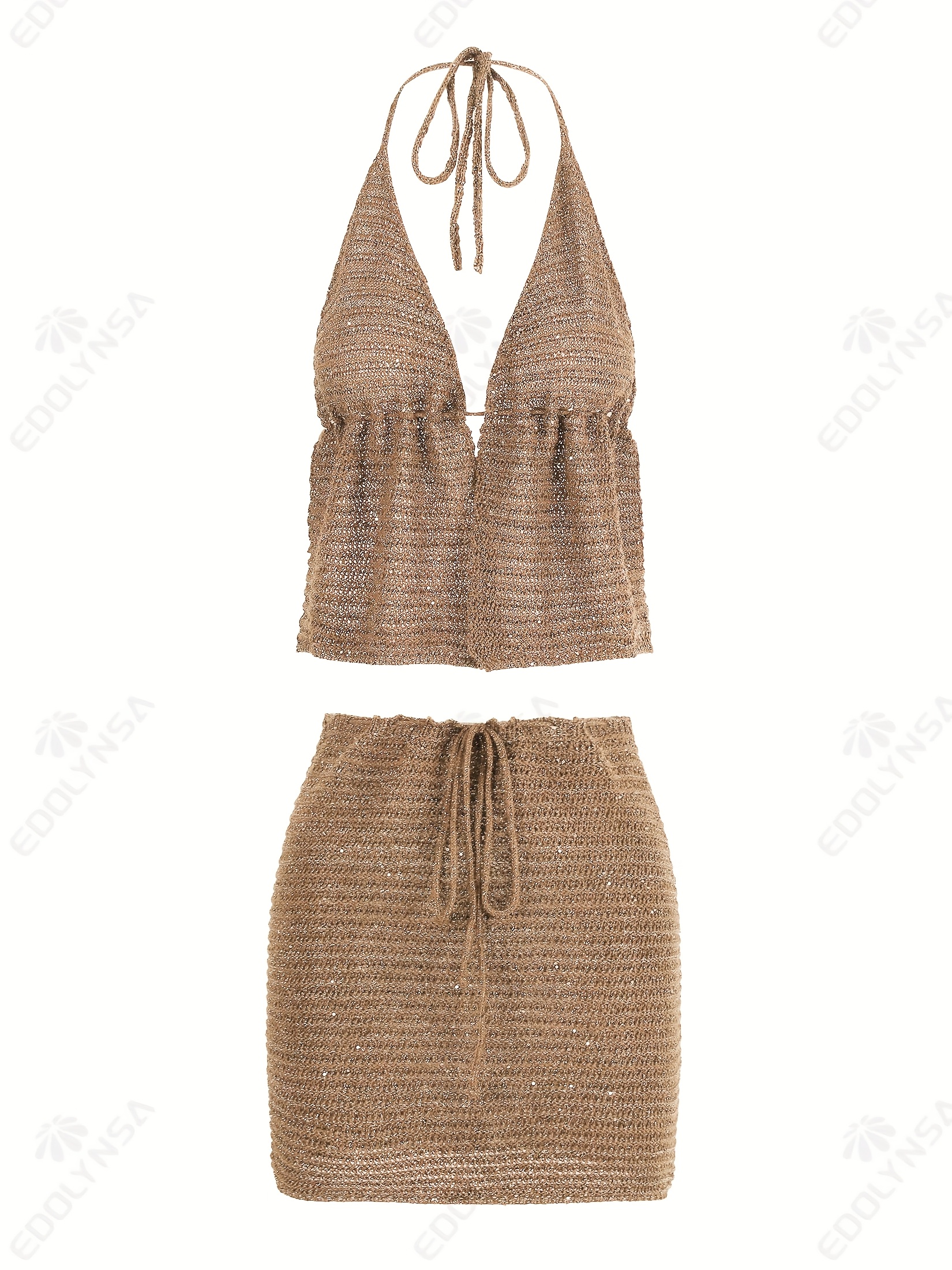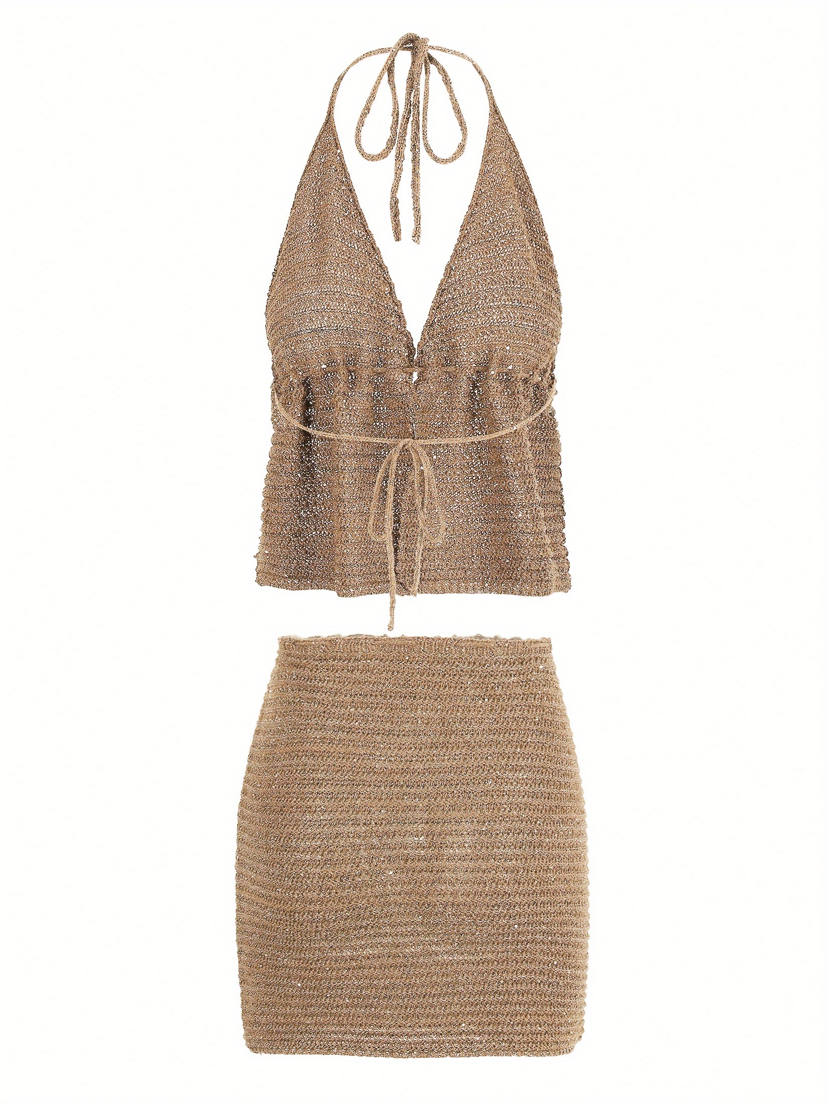 Set de dos piezas compuesto por top estilo bikini y falda ajustada con cordón y aberturas. Su diseño sexy y moderno es perfecto para verano, playa y vacaciones. El color caqui aporta un estilo elegante y versátil.
