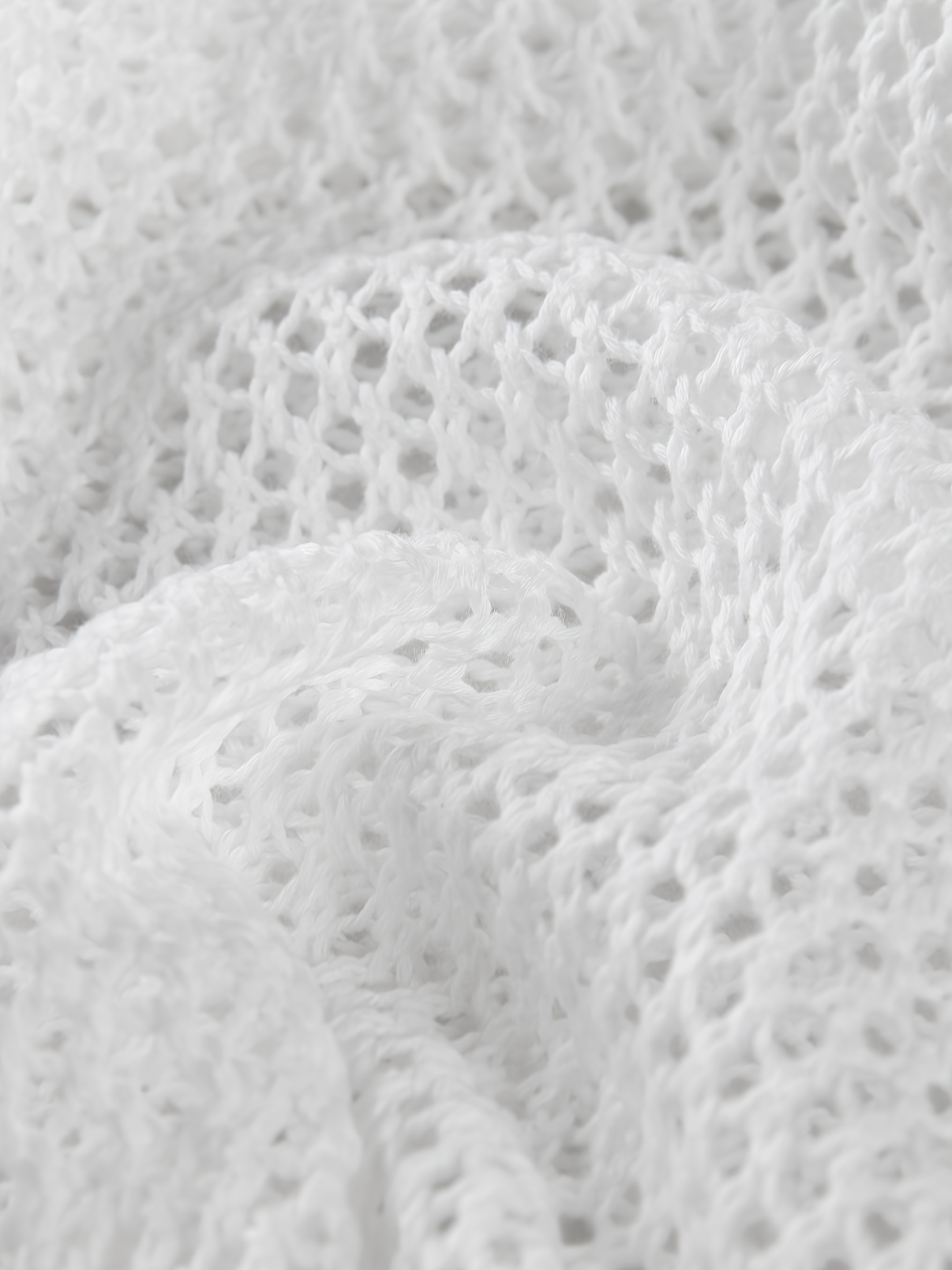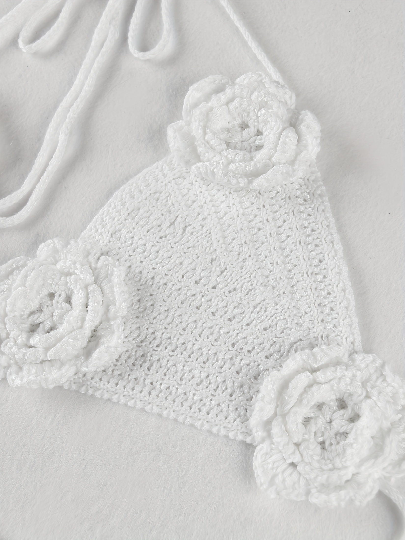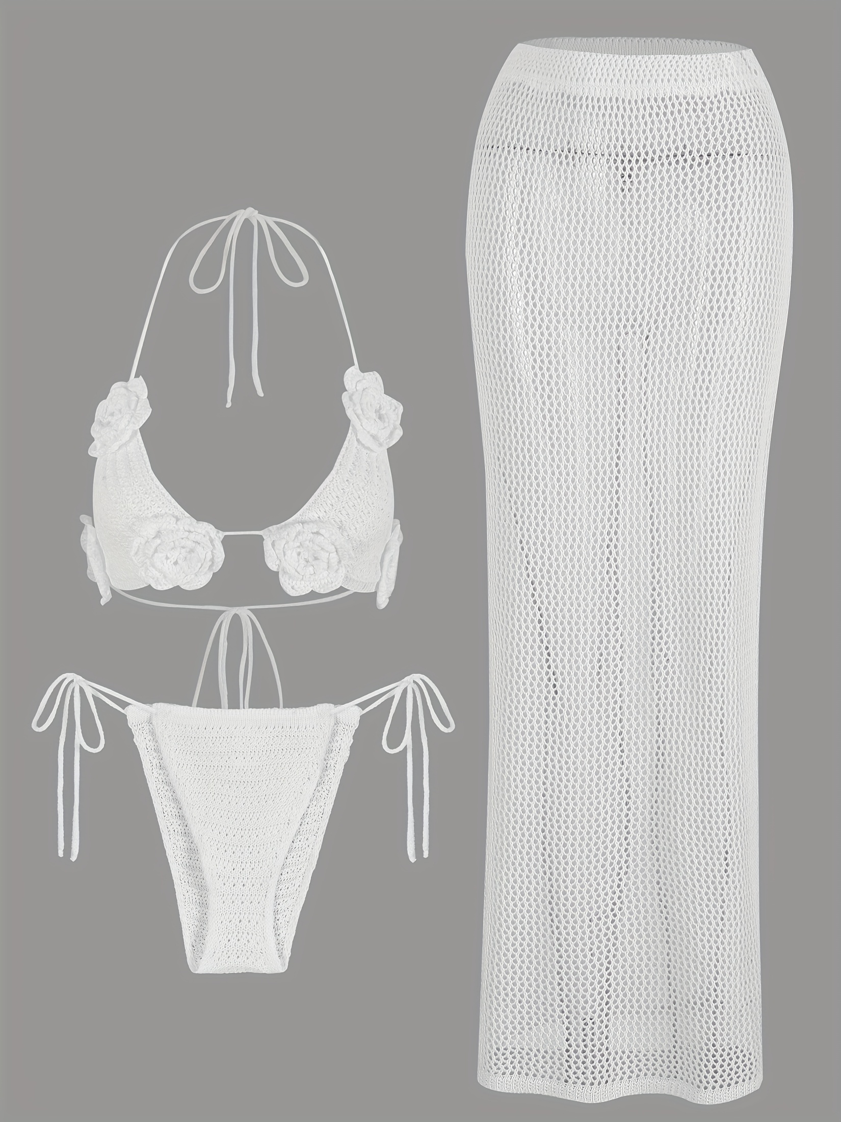 Set de bikini con top blanco de encaje artesanal, braga con lazos y falda larga transparente con abertura. Su diseño delicado y femenino es perfecto para sesiones de fotos, playa y vacaciones tropicales. El encaje aporta un toque romántico mientras que la falda añade elegancia y movimiento.