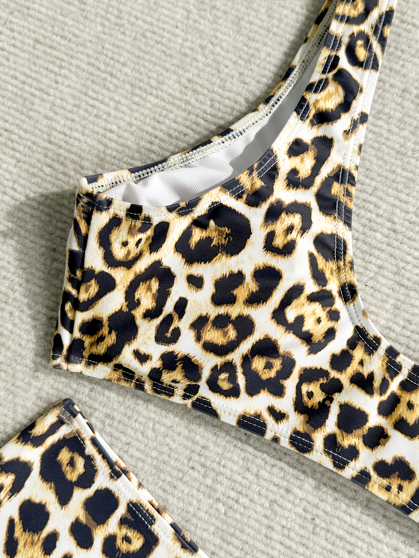 Este bikini combina un estampado de leopardo con un diseño moderno y atrevido. El top sin hombros y la estrella metálica aportan un toque único. La braga de cintura alta estiliza la figura y ofrece comodidad.