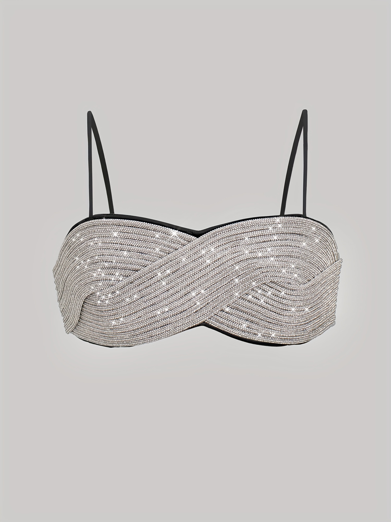 Top de tirantes finos con detalles de pedrería que añaden un toque elegante y moderno. Perfecto para combinar con jeans, faldas o outfits nocturnos. Su diseño versátil permite usarlo como prenda interior o exterior.