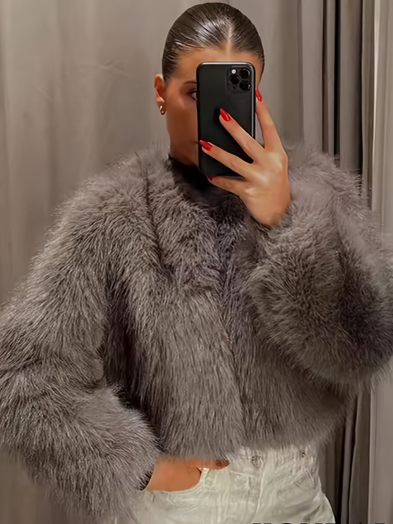 Chaqueta corta de peluche estilo zorro sintético. Suave, elegante y perfecta para crear looks de invierno con estilo. Fabricación de alta calidad.