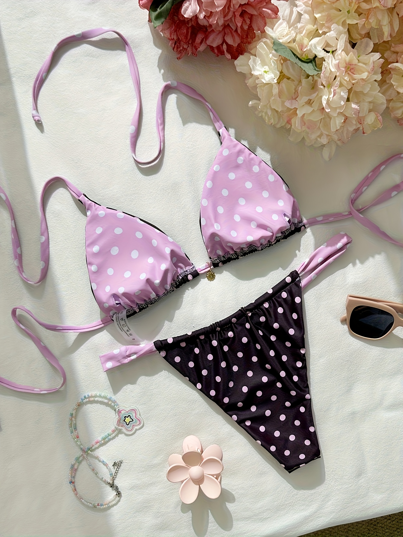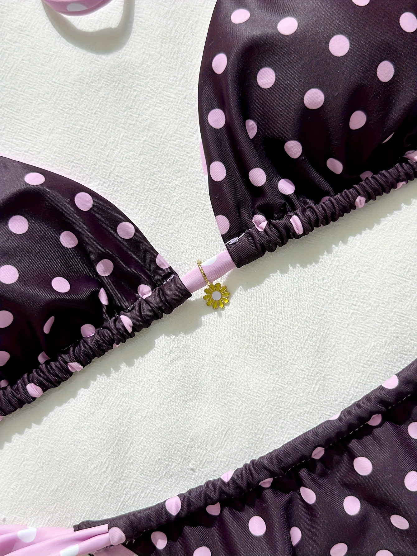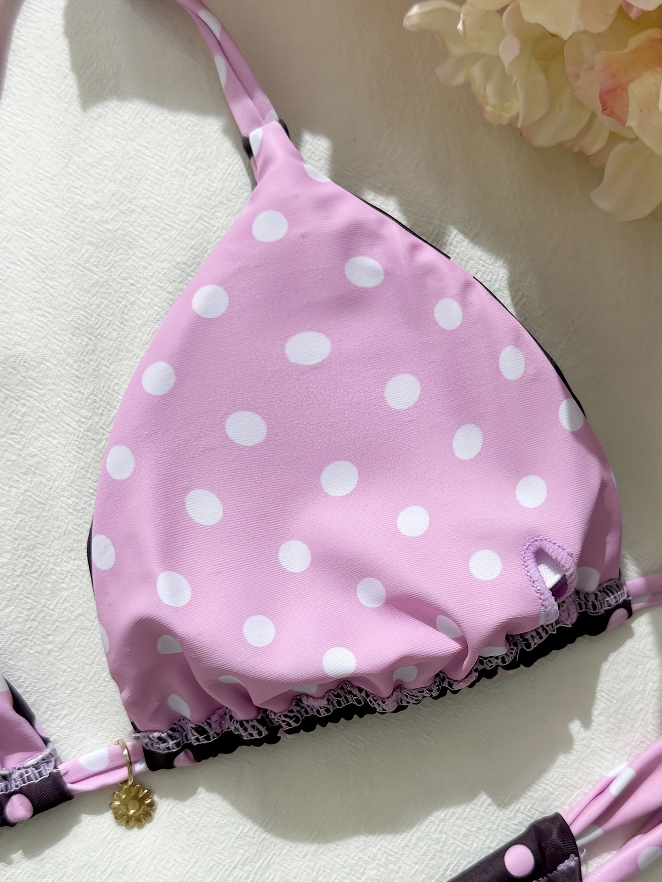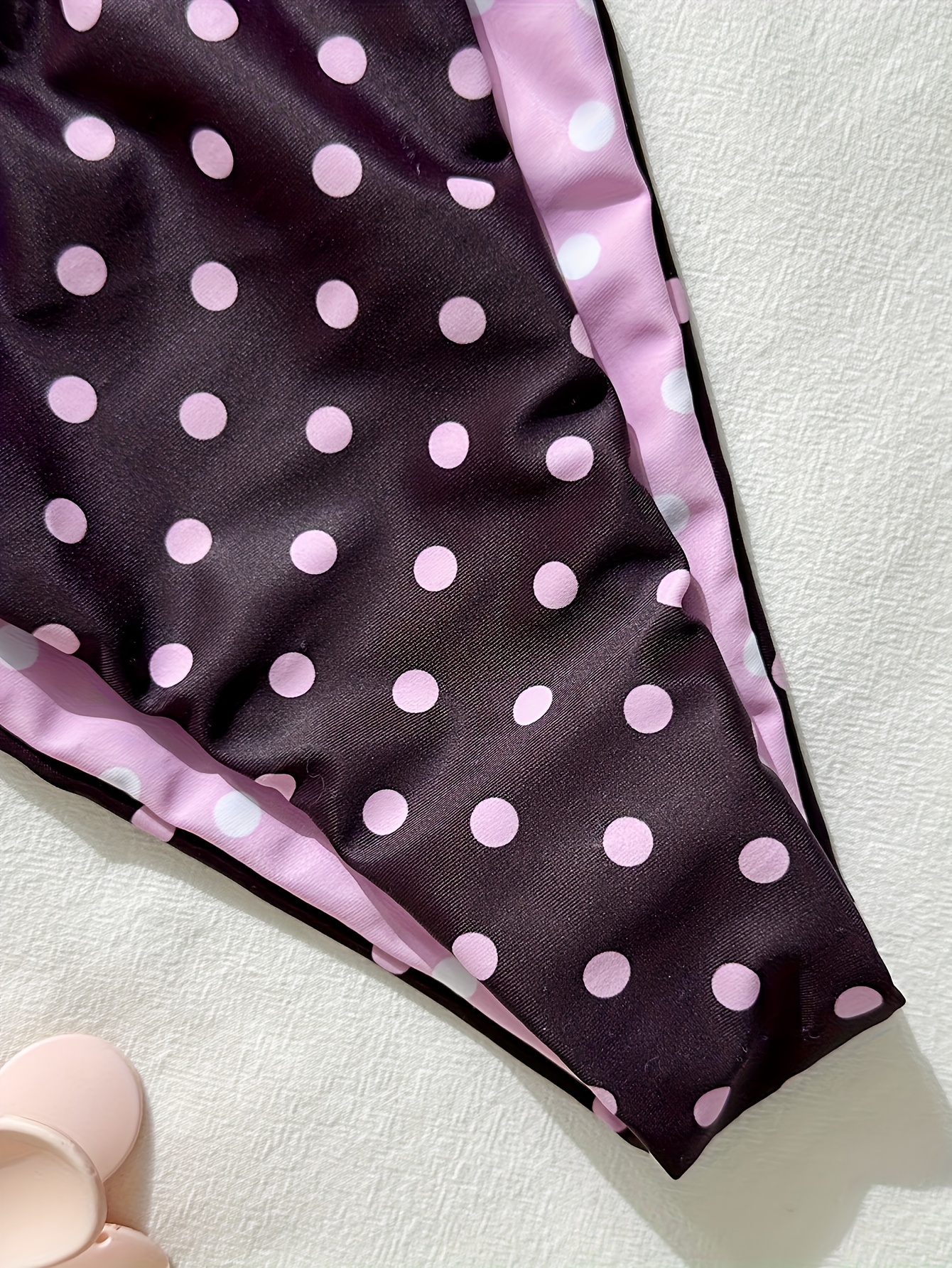 Bikini de dos piezas con estampado de lunares estilo retro. Su top halter y detalles de lazo aportan un toque femenino y clásico. Fabricado con tejido elástico, es perfecto para quienes buscan un look vintage y elegante en la playa.