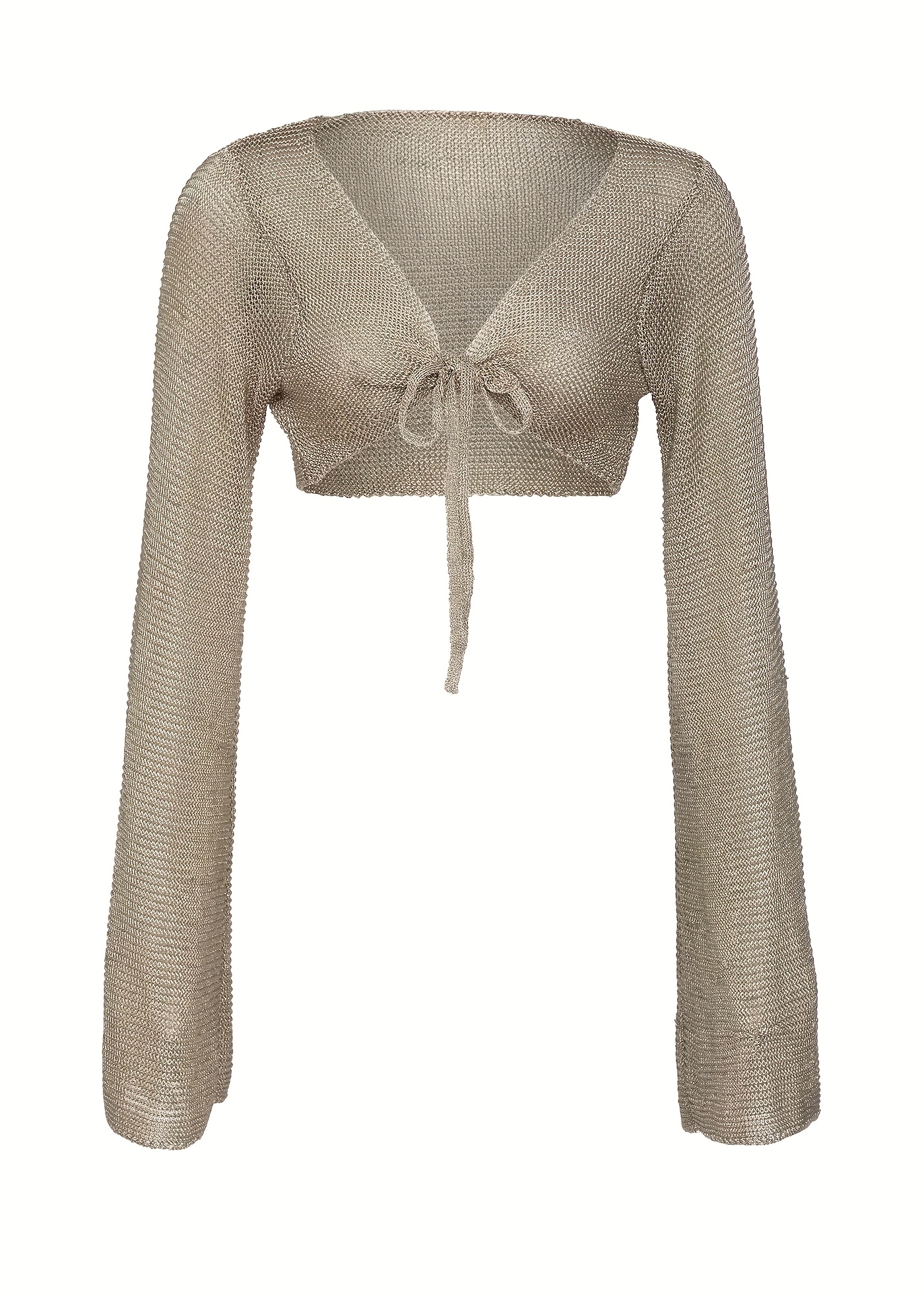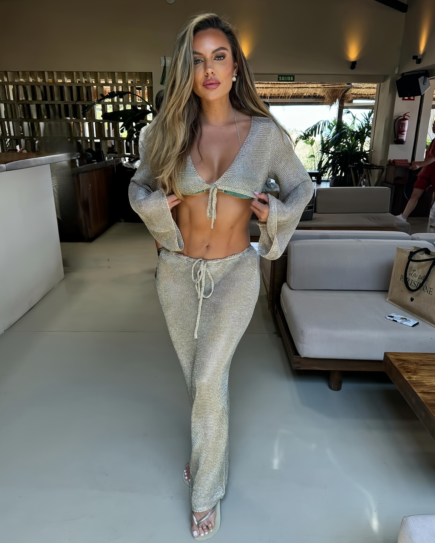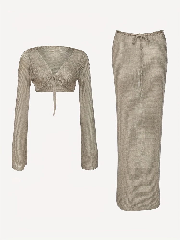 Conjunto de dos piezas compuesto por top de manga campana con cordón frontal y falda larga con abertura. Su diseño semitransparente y ligero es perfecto para usar como salida de playa. Aporta un look bohemio, fresco y elegante para vacaciones.