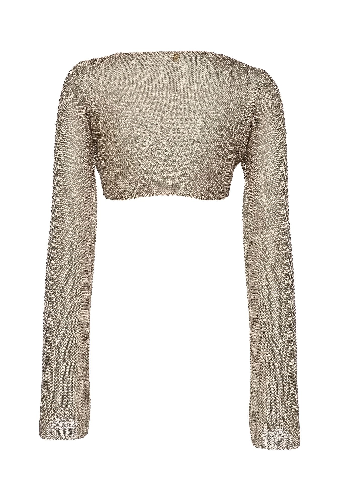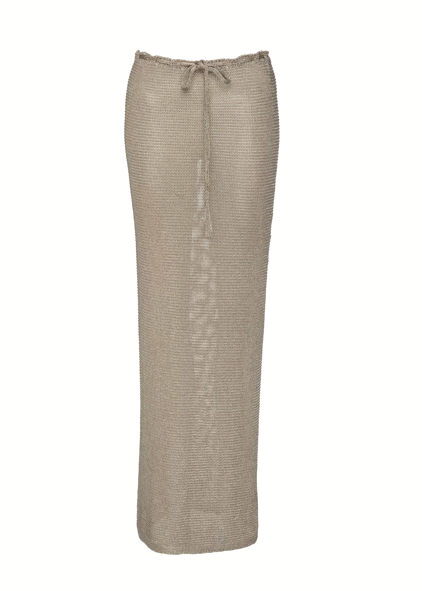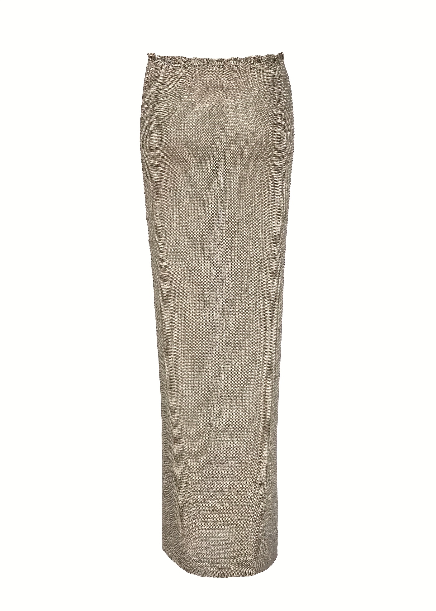 Conjunto de dos piezas compuesto por top de manga campana con cordón frontal y falda larga con abertura. Su diseño semitransparente y ligero es perfecto para usar como salida de playa. Aporta un look bohemio, fresco y elegante para vacaciones.