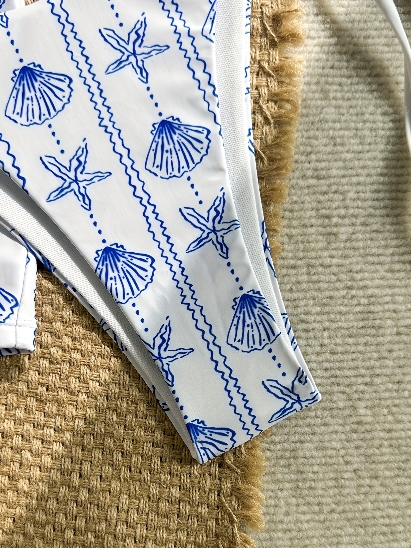 Set de tres piezas con estampado azul y blanco de conchas y estrellas. Incluye top, braga y salida ligera. Ideal para vacaciones tropicales, sesiones de fotos y días de playa.