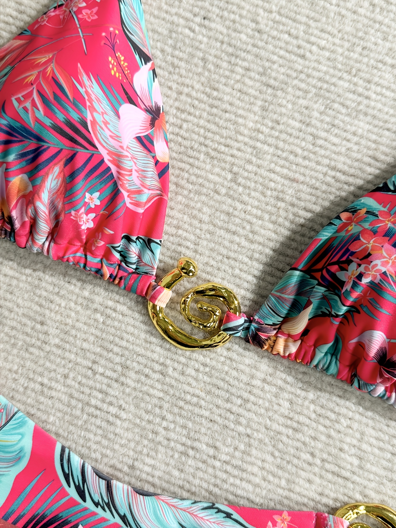 Un bikini diseñado para quienes buscan un look sensual y favorecedor. El top triangular realza el busto y la braga de corte alto alarga visualmente las piernas. Su tejido elástico garantiza comodidad y libertad de movimiento, ideal para vacaciones y días de playa.