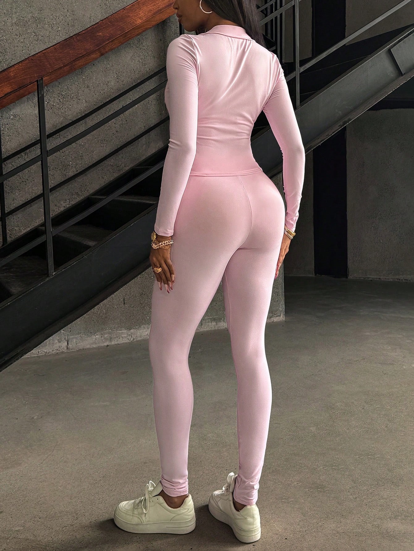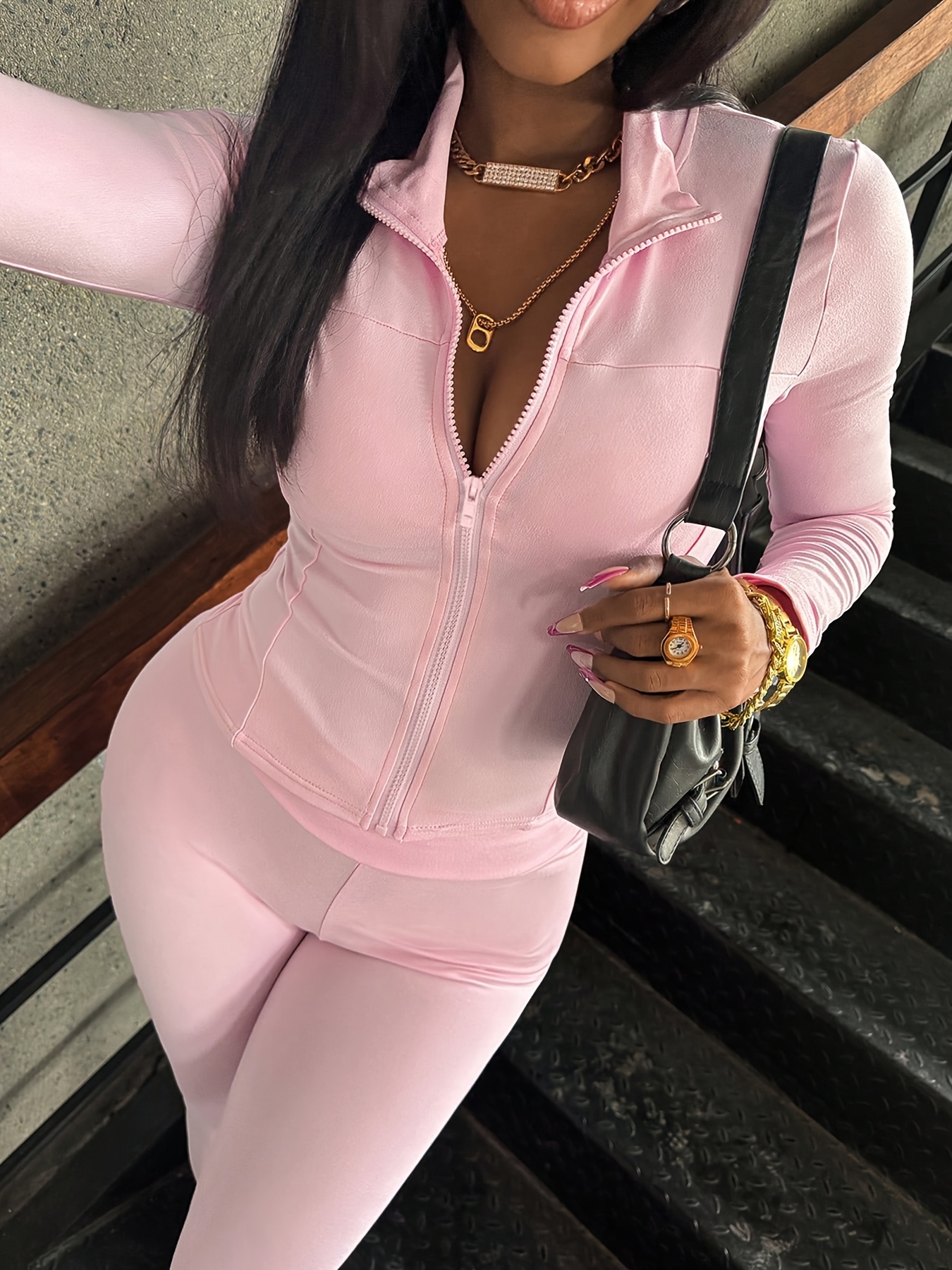 Conjunto de dos piezas con top de manga larga con cremallera y pantalón a juego. Ideal para otoño, entrenamientos y looks urbanos.